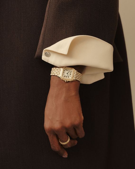 Lastly, she finished off the look with some gold pieces from Cartier, a watch, studded earrings and a ring you can wear with anything. Consider these investments you’ll wear again and again.